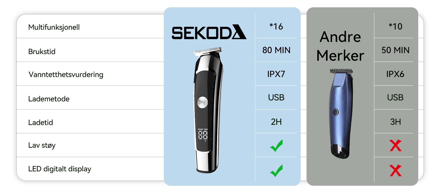 Sekoda-klipperen er utstyrt med et høyytelses litiumbatteri som gir langvarig kraft, slik at du kan si farvel til ladebryderier. Enten du klipper hår for hele familien eller pakker den for en lang tur, er den alltid klar til å gi en uavbrutt grooming-opplevelse, når som helst, hvor som helst.
